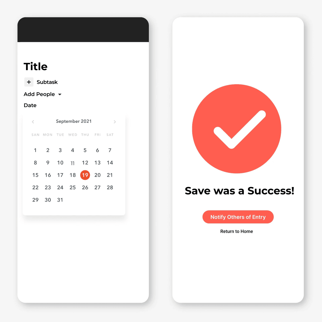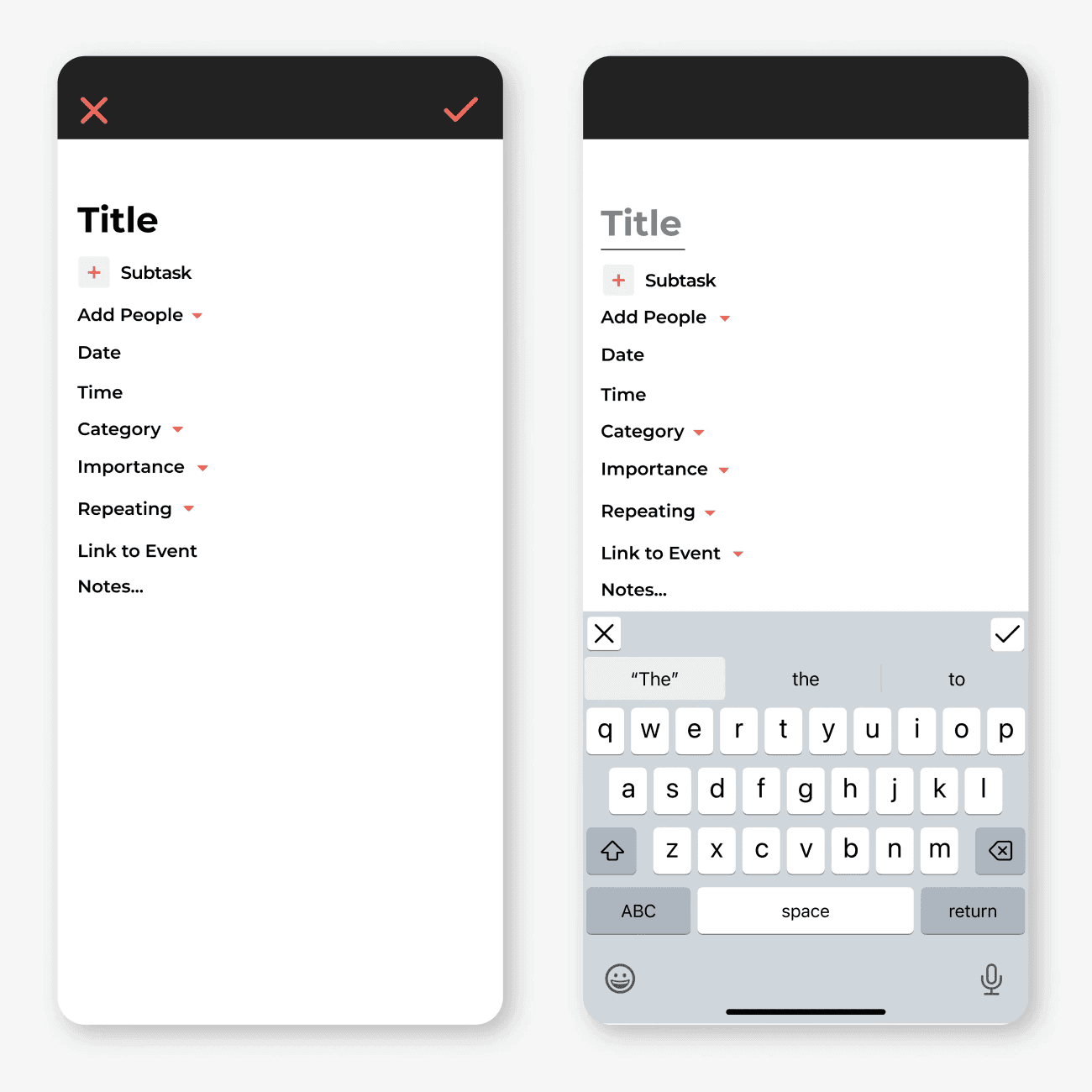 The app features a guided modal for adding tasks, with optional subtasks, assigned users, and scheduled dates and times. A red and black palette reinforces the focused, productive feel, while the typeface, often seen in UI design, allows the app to feel familiar. The linework pattern symbolizes organization and tying up loose ends, reflecting the brand’s core purpose, keeping your family in the loop.